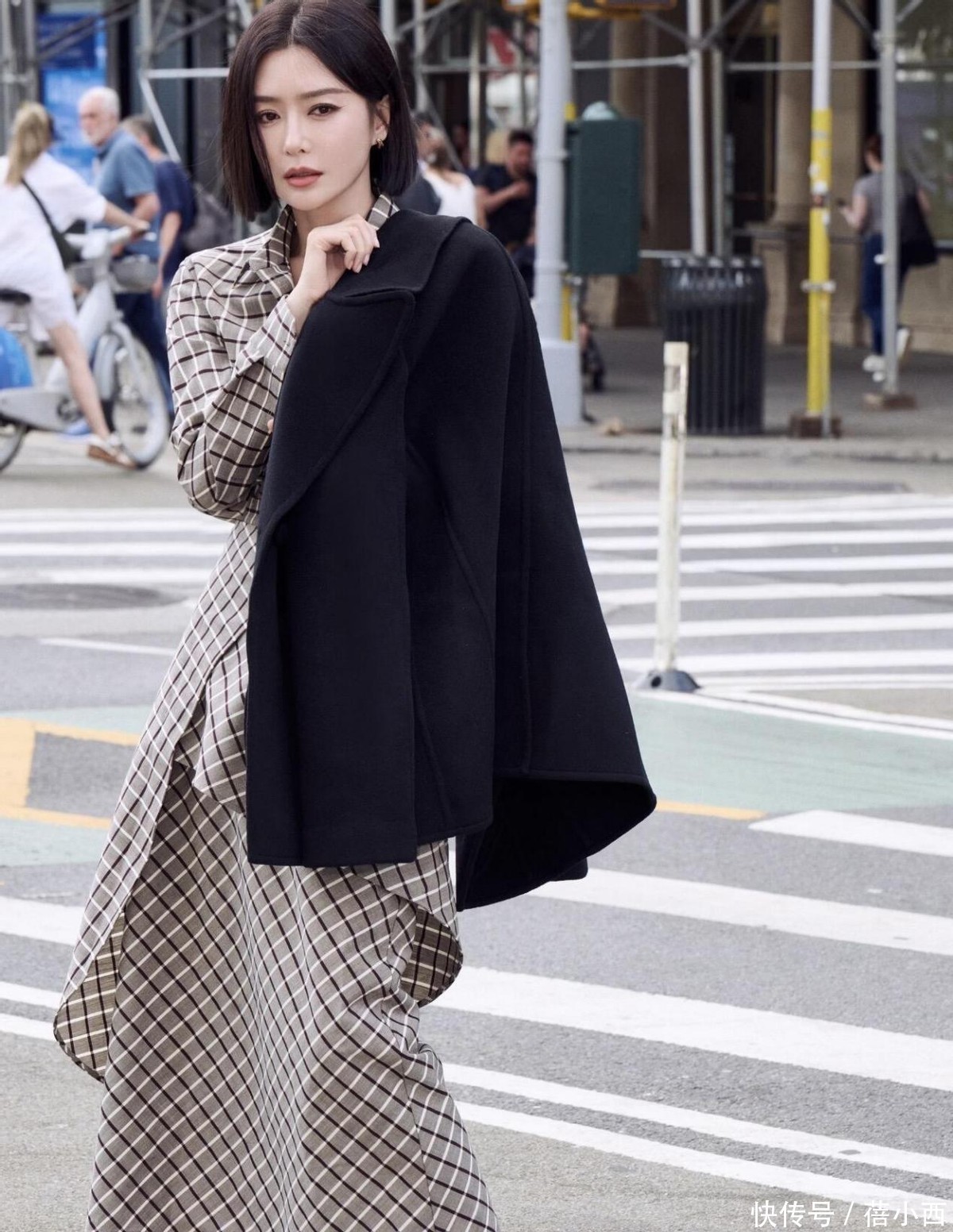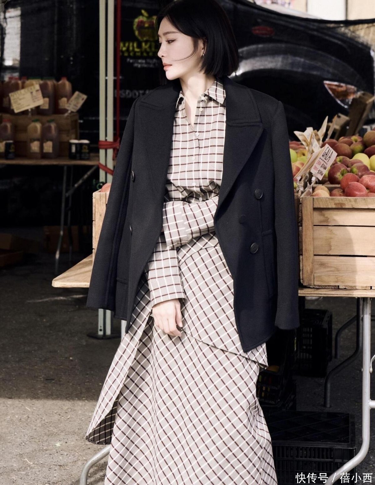黑色西装向来是酷飒的代名词,但秦岚没有走常规的“西装+裤装”路线,而是选择格纹衬衫连衣裙作为内搭,瞬间柔化了西装的硬朗感。
