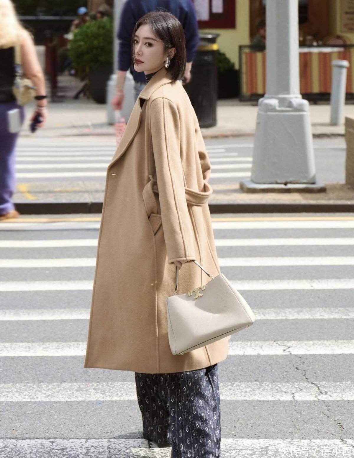 秦岚这套驼色大衣搭配印花阔腿裤的街拍造型,更是打破了大衣只能配基础裤装的思维定式,把经典单品玩出了新花样。46岁的她用驼色双面呢大衣搭配藏青印花阔腿裤,再拎一只米白色手提包,将优雅与随性完美融合,保留了驼色大衣的高级质感,又靠印花裤装增添了灵动趣味,成为熟龄女性冬日穿搭的又一范本。